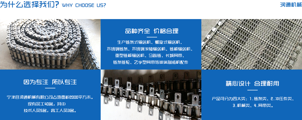 生產(chǎn)鏈條式輸送機(jī)、螺旋式輸送機(jī)、不銹鋼鏈條、不銹鋼滾軸輸送機(jī)、鏈板輸送機(jī)、重型鏈板輸送機(jī)、馬蹄鏈、長城網(wǎng)帶、鏈條鏈輪、乙字型網(wǎng)帶等玻璃制瓶機(jī)配件,食品機(jī)械配件及各種網(wǎng)帶的專業(yè)廠家 ,多年來產(chǎn)品暢銷各地玻璃廠和食品廠,在玻璃制品等行業(yè)中享有較高的聲譽(yù)。公司集摸具開發(fā)、機(jī)械設(shè)計(jì)生產(chǎn),銷售于一體的生產(chǎn)型企業(yè)。生產(chǎn)的自動化流水線金屬傳動網(wǎng)帶、鏈條等產(chǎn)品廣泛用于玻璃機(jī)械、食品機(jī)械、化纖機(jī)械、醫(yī)藥、電子、烘干機(jī)械、輪胎機(jī)械等行業(yè)。產(chǎn)品多銷往各個城市的機(jī)械廠、食品廠和一些涉及流水線或自動化設(shè)備的公司。